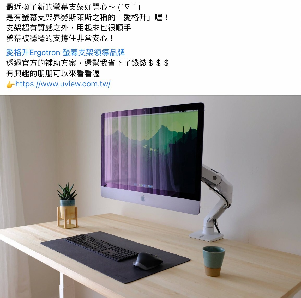 發文到您的FB或IG分享完成安裝好螢幕支架的照片,內容需寫到關鍵字 #愛格升 、@愛格升Ergotron 螢幕支架領導品牌 & 放上愛格升官網連結唷!
