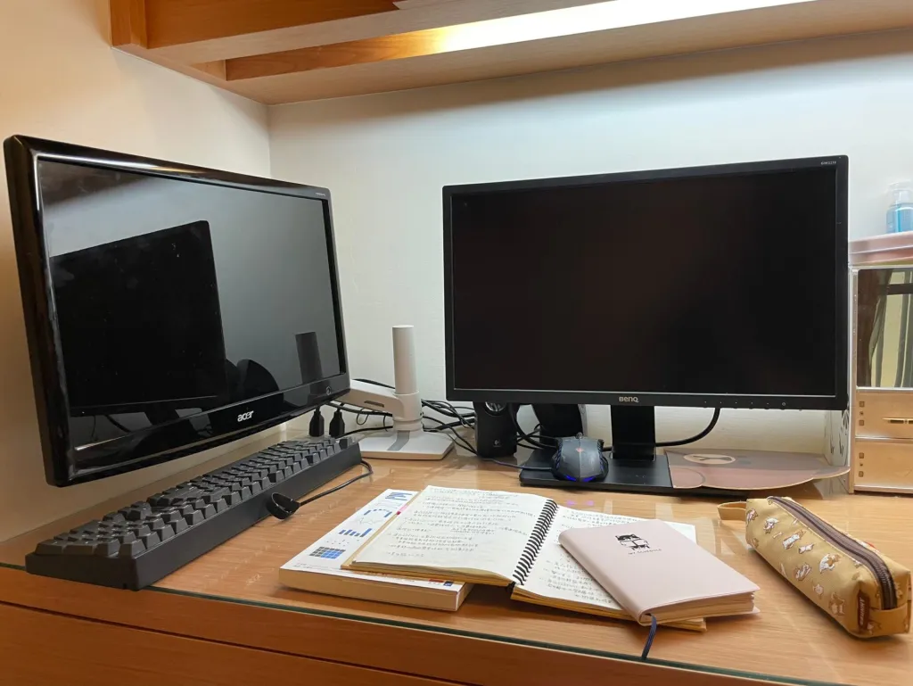 原本使用的螢幕支架在上下移動的時候會一直往下沉,高度也不太夠,換了愛格升的雙螢幕支架後,除了在轉動螢幕角度的時候更好調整,還可以裝上筆電盤,讓我能同時使用桌電跟筆電,真的非常方便!