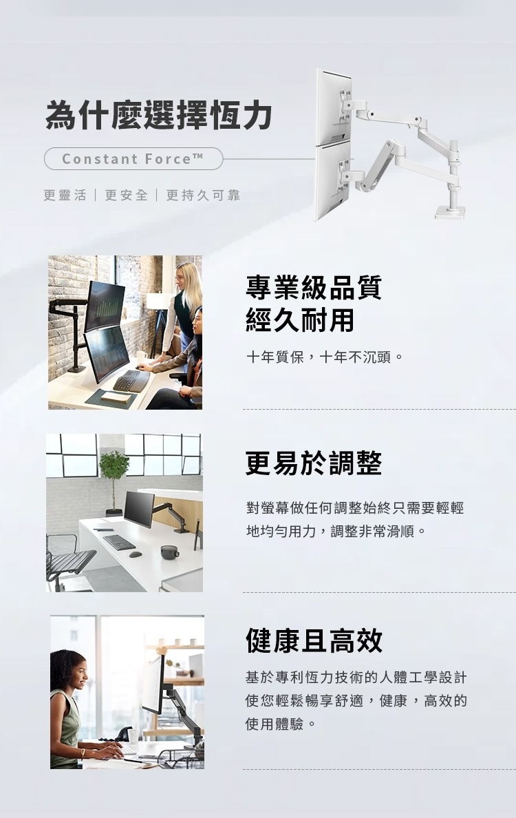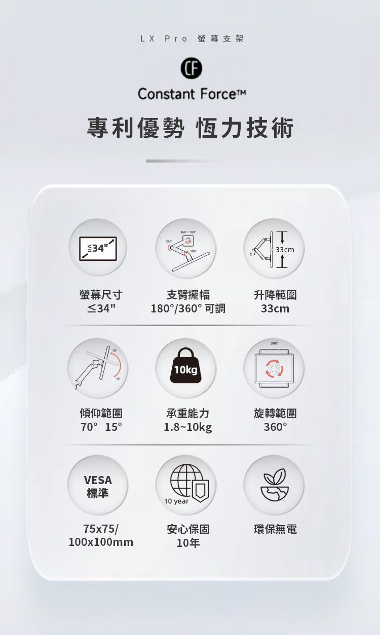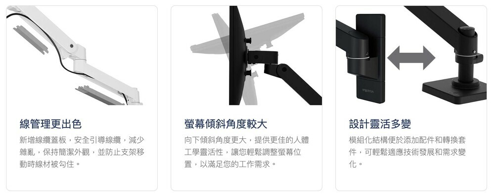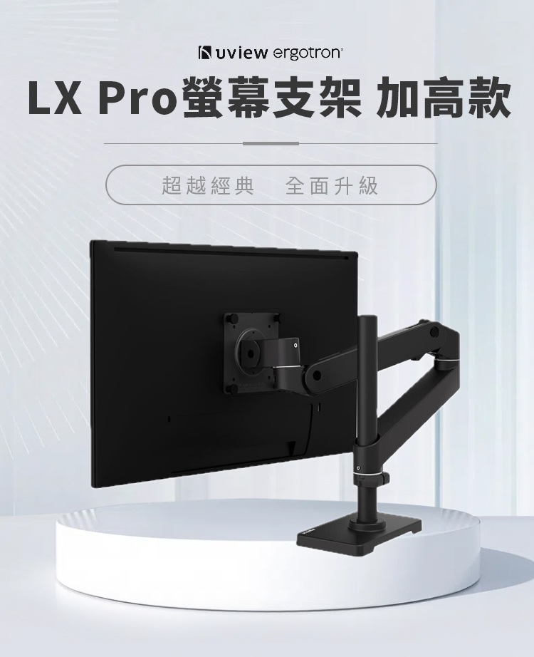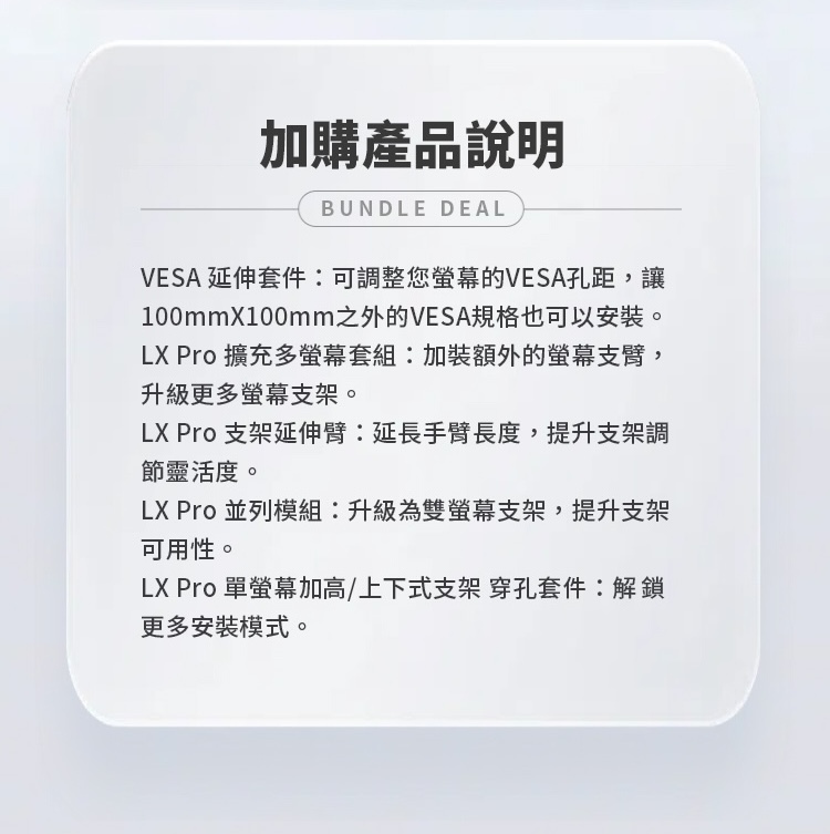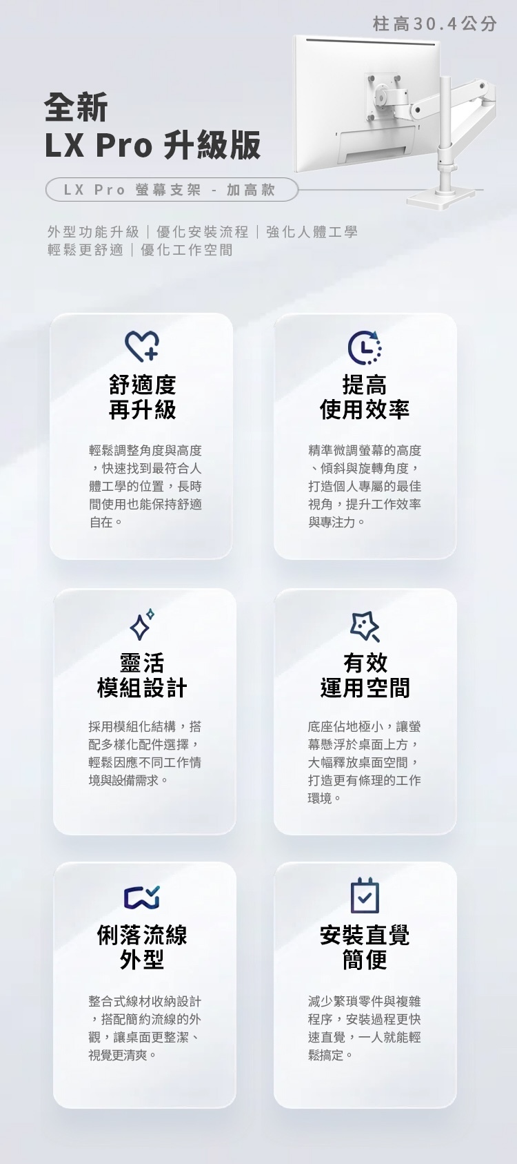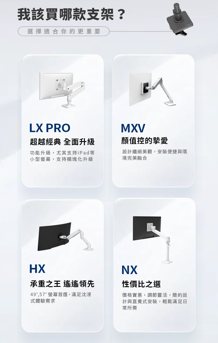 延續LX支架優點、設計加入更多功能,為你帶來更加卓越的使用者體驗,搭配額外模組,還能一秒升級雙螢幕支架。