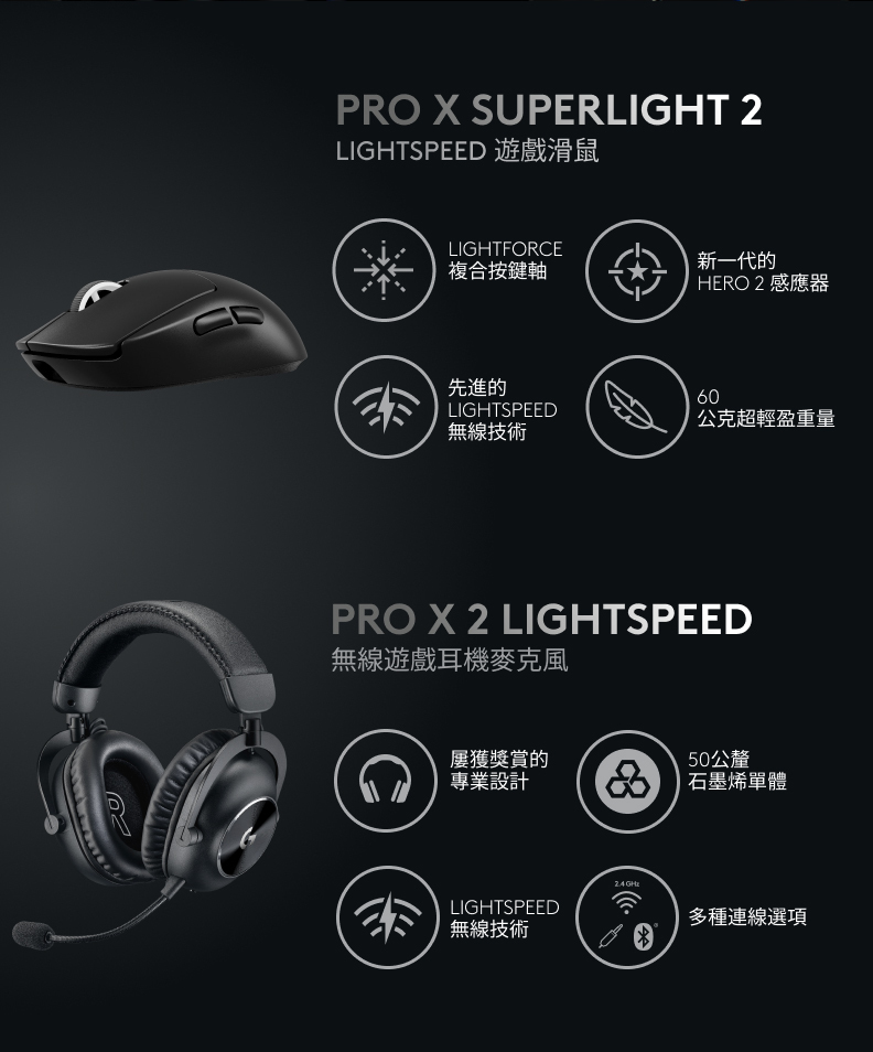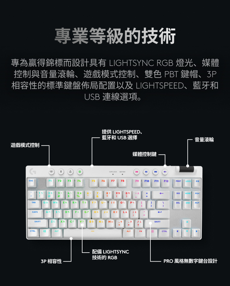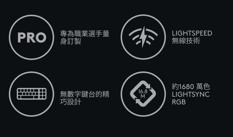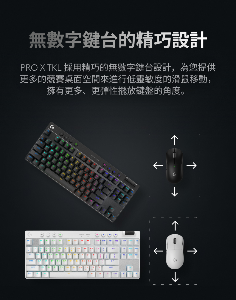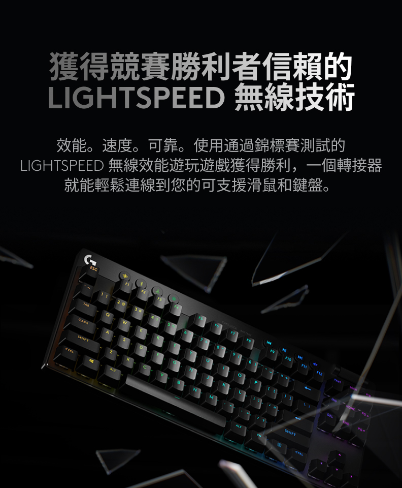 無數字鍵設計提供更多的競賽桌面空間來進行滑鼠的移動,搭配先進GX機械式按鍵軸及雙色PBT鍵帽,獲得競賽勝利者信賴的LIGHTSPEED無線技術,一個轉接器就能輕鬆連接可支援的滑鼠及鍵盤