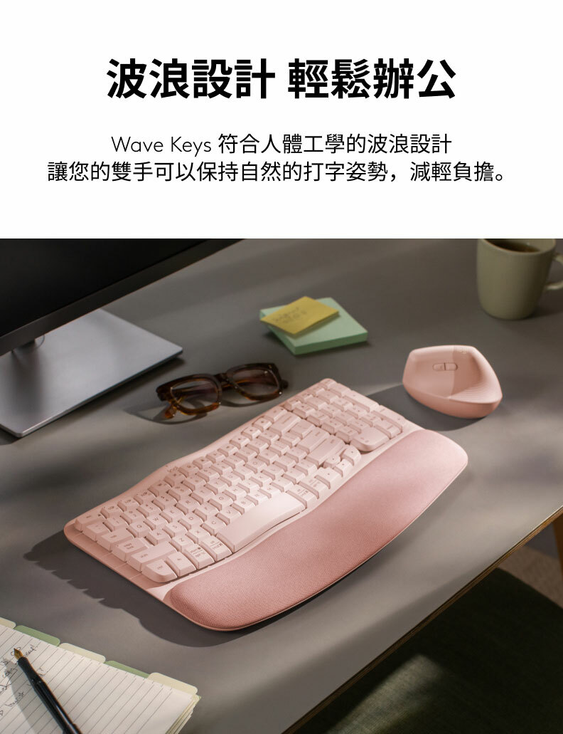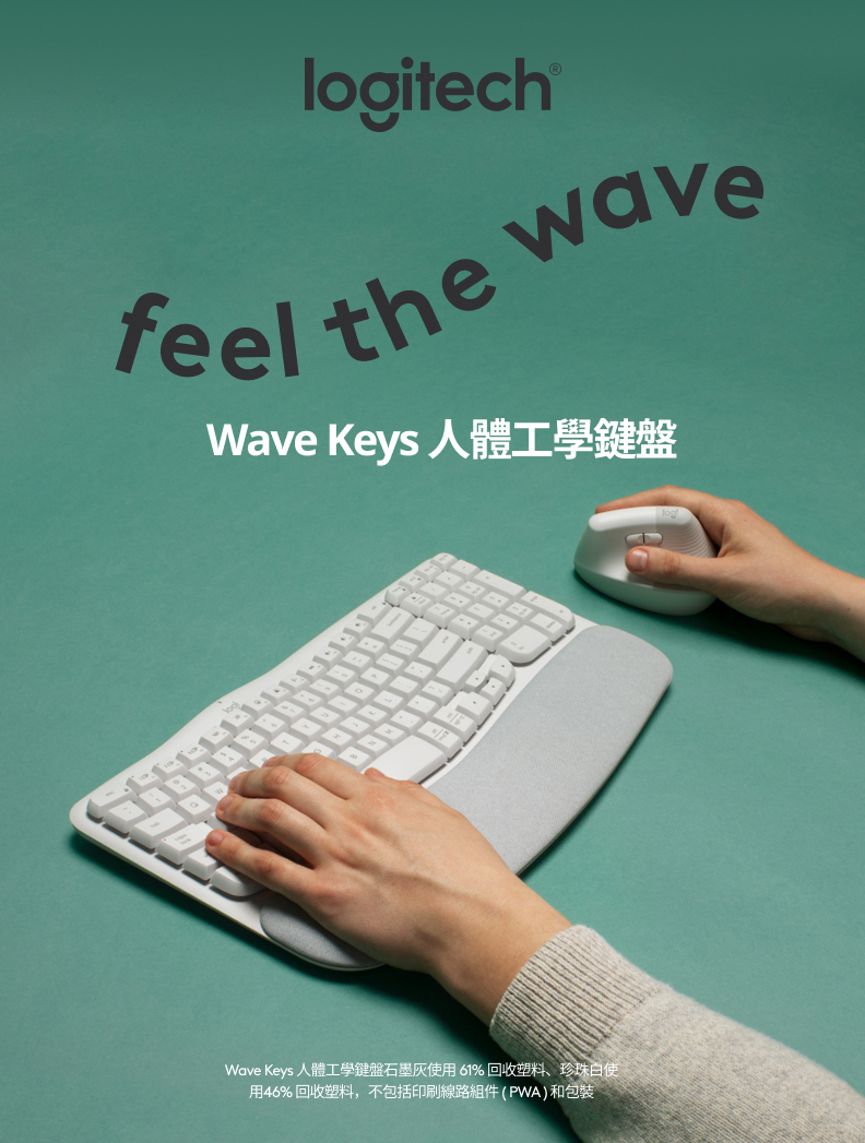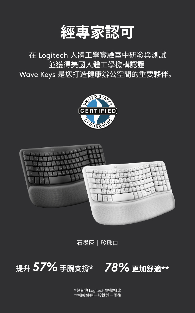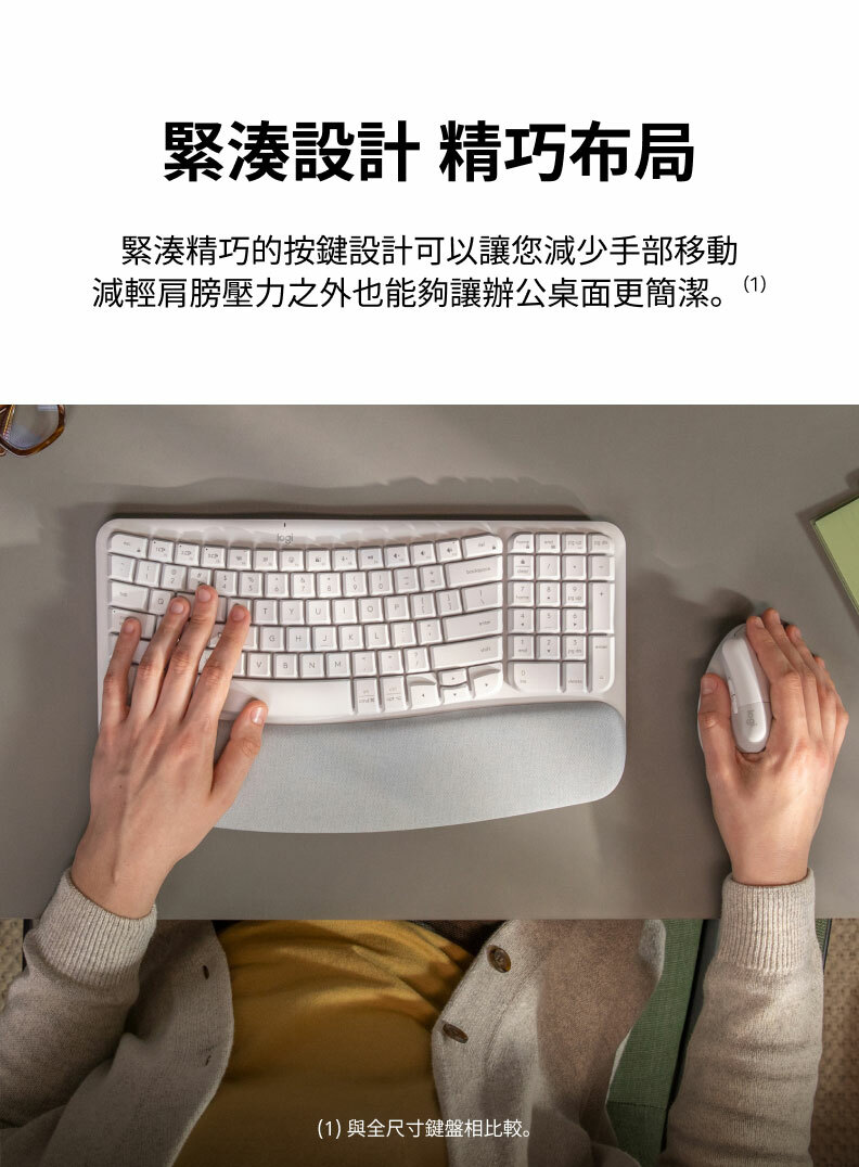 提升57%手腕支撐、78%更加舒適,WaveKeys符合人體工學的波浪設計,讓雙手可以保持自然的打字姿勢、減輕負擔。緊湊精巧的按鍵設計可以讓您減少手部移動,減輕肩膀壓力之外還能讓辦公桌面更簡潔,三層舒適材質為手腕提供所需的支撐減輕手腕壓力。