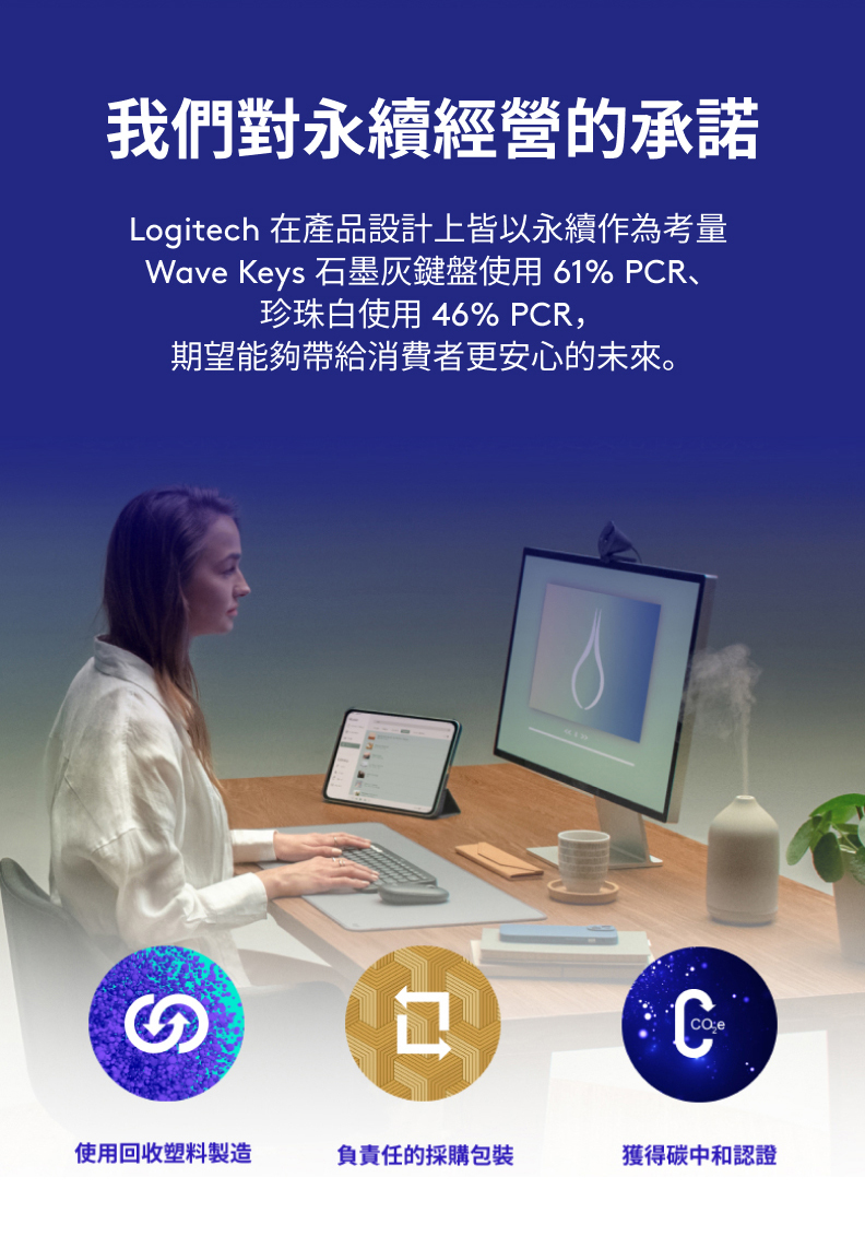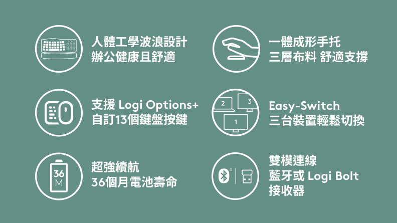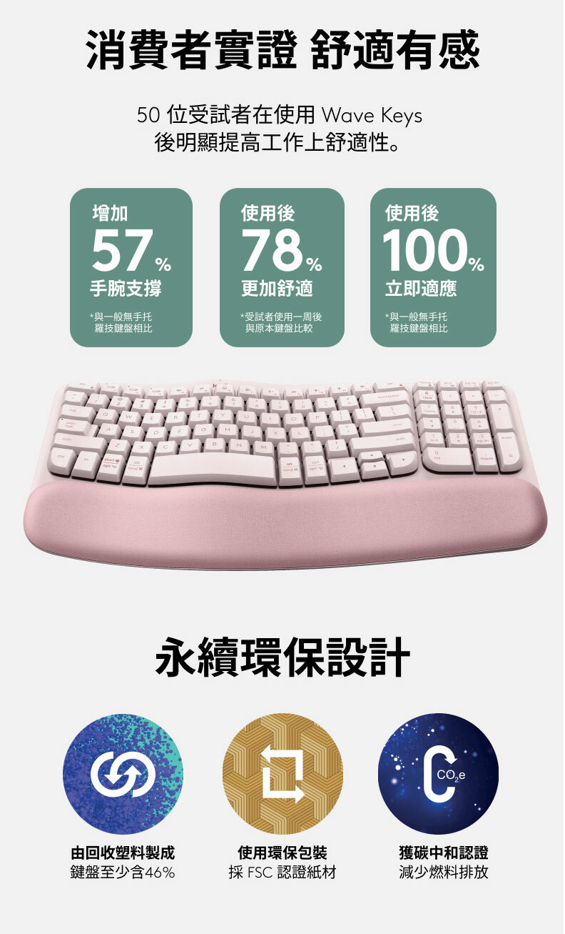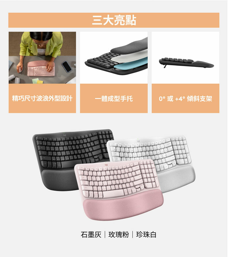提升57%手腕支撐、78%更加舒適,WaveKeys符合人體工學的波浪設計,讓雙手可以保持自然的打字姿勢、減輕負擔。緊湊精巧的按鍵設計可以讓您減少手部移動,減輕肩膀壓力之外還能讓辦公桌面更簡潔,三層舒適材質為手腕提供所需的支撐減輕手腕壓力。