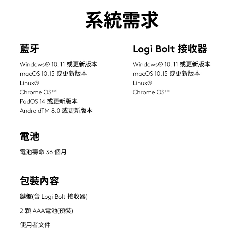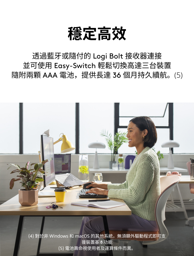 透過藍牙或隨付的LogiBolt接收器連接,並可使用 EasySwich輕鬆切换高達三台裝置。隨附兩顆AAA電池提供長達36個月持久續航。